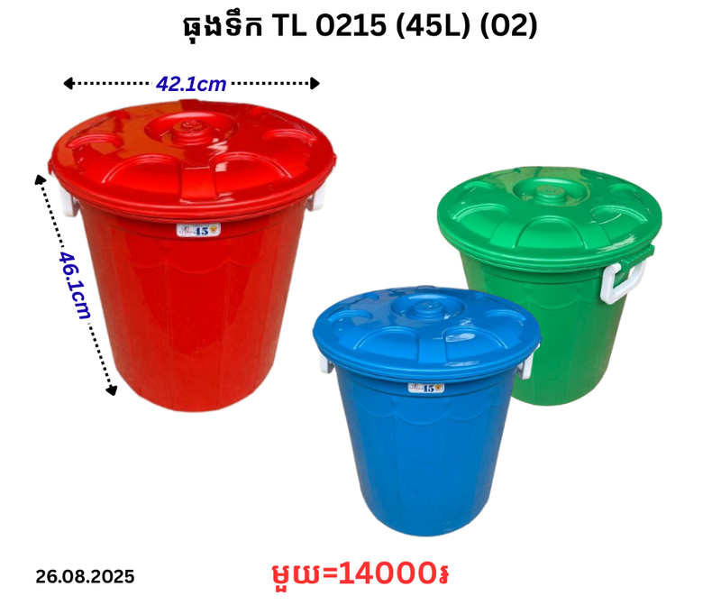 ធុងទឹក TL 0215 (45L) (02) December 24, 2025 Posted in 14000, TL, ធុងទឹក, ធុងទឹក TL Product Code : 0215