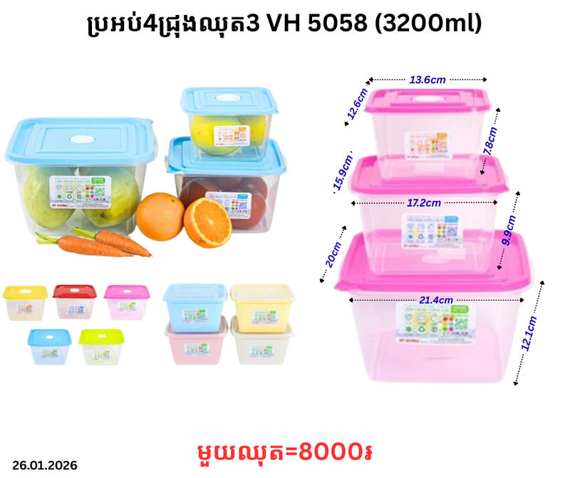 ប្រអប់4ជ្រុងឈុត3 VH 5058 (5056) (3200ml) January 27, 2026 Posted in 8000, VH, ទំនិញថ្មី, ប្រអប់, ប្រអប់ឈុត, ប្រអប់ឈុតជ្រុង Barcode : 8935124550587