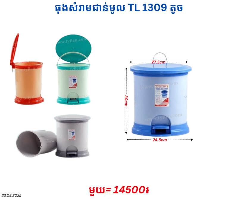 ធុងសំរាមជាន់មូល TL 1309 តូច December 23, 2025 Posted in 14500, TL, ធុងសំរាម, ធុងសំរាមជាន់, ធុងសំរាមជាន់មូល, ធុងសំរាមជាន់មូល TL Barcode : 8936082381947